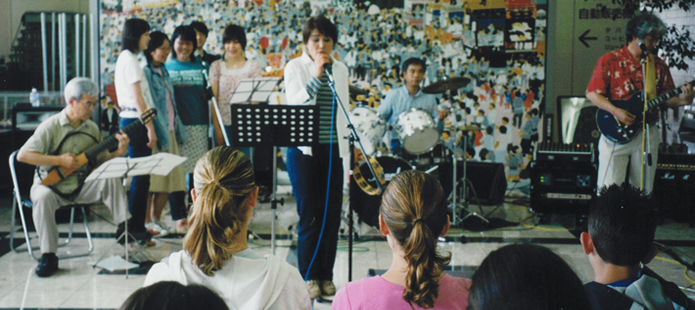 成田市ではアメリカのサンブルーノ市と姉妹都市の締結がされており、年に一度中学生が互いの市を訪問し交流を図っており、毎年7月上旬にサンブルーノの中学生が成田市を訪れたときに後藤さん(Acoustic Guitar)の発案で歓迎ミニコンサートを開催しています。今回は2度目のコンサートですが、オリジナルメンバーのボーカリスト「Ryu」さんが出演できなかったため、ドラムス「Yoshimi」さんの奥様「Rumi」さんがボーカルを務めます。