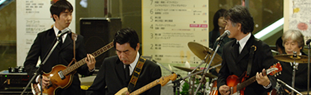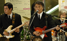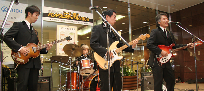 千葉そごうで「スーパー親父バンドフェスティバル」が開催され、テープ審査を通過した8組が参加しました。ビートルズの来日40周年ということで、課題曲がビートルズであったためKSO2もビートルズの「Slow Down」等数曲演じました。全国18店舗で開催されたフェスで各地区の優勝バンドはビートルズが来日した祭に記者会見したキャピトル東急の真珠の間で開催されるBAND LIFE 2006への出場権が得られるということでKSO2としては初めてのコンテストでしたが、優勝を意識しなかったためか、気負いもせず普段着の演奏に努めたところラッキーにも親父度No.1と称され審査員全員の推薦により優勝することができました。詳細につきましては「SPECIAL REPORT」のページに掲載中です。 |