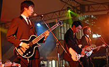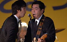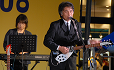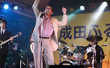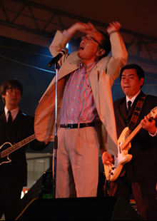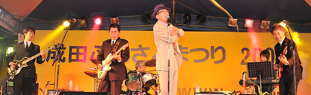 今回で2度目の成田ふるさとまつり出演になります。 昨年はイエローキャブのタレント「仲村瑠璃亜」さんの飛び入り等で盛り上がったのですが、今年は、何と! 現役成田市長(小泉一成さん)がスペシャルゲストとして出演していただきました。小泉市長さんは沢田研二さんのファンとのことで曲「勝手にしやがれ」を熱唱していただき、バックでアドリブを奏でるリードギターの教育長とのコラボレーションがお客様の目を釘付け。 市長さんが帽子を観客に向けて飛ばした時、会場は最高潮に達していました。やはり、相変わらずの人気!!健在です。 |