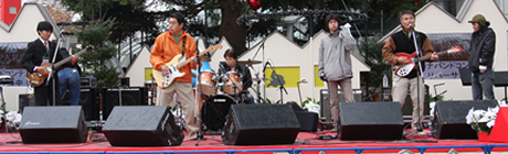 フジテレビのお台場オトナPARK内に設置されたツリーステージにて「第2回集まれ!!オトナバンド」コンテストが開催され、幸運にもビデオ審査により通過した8組の出演バンドに選ばれました。当日の天候は開演時間を待っていたかのように、雨が降り出しKSO2の出番にはドシャ降り。それでもボーカルの「OGAWA」は極寒のさなかビショ濡れになりながらも熱唱し、MCの桑野信義氏に絶賛されるも優勝には及びませんでした。このステージではレギュラーメンバーのベース「KATOH」が出演できなかったため、助っ人として同じ職場の「GUNJI」に急遽お願いしたところです。 |