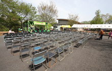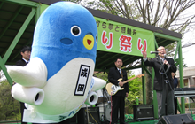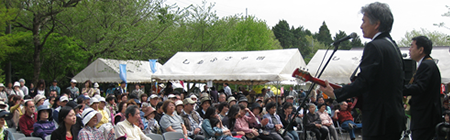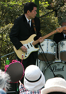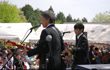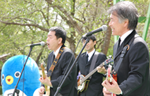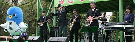 しもふさ学園は、今年で創立22周年を迎え、その歴史とともに「みどり祭り」も地域の方々に支えられ、1000人近くの来場者を迎える法人全体の大きなお祭りとなっております。みどり祭りは福祉施設を理解してもらう為に地域住民との交流行事を行うもので、今年はゲストに「園まり」さんを迎えての催しとなりましたが、KSO2はその前座を務めさせていただきました。成田市長さんも成田市の特別観光大使に任命された観光PRキャラクター「うなりくん」の紹介とともにKSO2の演奏で沢田研二の「勝手にしやがれ」を歌われ、観客からは大声援が飛び非常に盛り上がったライブとなりました。 |