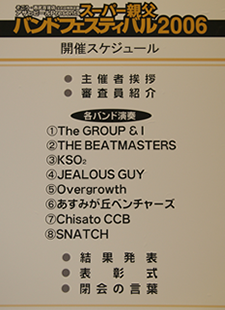 千葉そごうで「スーパー親父バンドフェスティバル」が開催され、テープ審査を通過した8組が参加しました。ビートルズの来日40周年ということで、課題曲がビートルズであったためKSO2もビートルズの「Slow Down」等数曲演じました。全国18店舗で開催されたフェスで各地区の優勝バンドはビートルズが来日した祭に記者会見したキャピトル東急の真珠の間で開催されるBAND LIFE 2006への出場権が得られるということでKSO2としては初めてのコンテストでしたが、優勝を意識しなかったためか、気負いもせず普段着の演奏に努めたところラッキーにも親父度No.1と称され審査員全員の推薦により優勝することができました。詳細につきましては「SPECIAL REPORT」のページに掲載中です。 |
