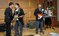 当バンドのリーダー「Sekine」氏の長男の結婚披露宴にKSO2のメンバー全員が招待され祝演奏しました。長男の大ちゃんは幼児の頃からKSO2の舞台に花束を持って上がったり、学生時代には自らバンドを結成していたとのことで蛙の子は蛙ですネ。いつの間にか立派になられて、KSO2のメンバーがすっかり親父になるのも無理のないことです。