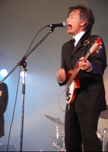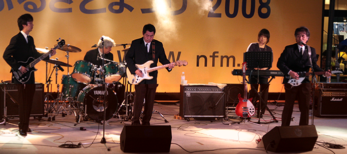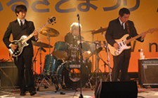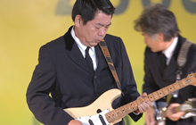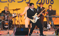 今回で2度目の成田ふるさとまつり出演になります。 昨年はイエローキャブのタレント「仲村瑠璃亜」さんの飛び入り等で盛り上がったのですが、今年は、何と! 現役成田市長(小泉一成さん)がスペシャルゲストとして出演していただきました。小泉市長さんは沢田研二さんのファンとのことで曲「勝手にしやがれ」を熱唱していただき、バックでアドリブを奏でるリードギターの教育長とのコラボレーションがお客様の目を釘付け。 市長さんが帽子を観客に向けて飛ばした時、会場は最高潮に達していました。やはり、相変わらずの人気!!健在です。 |