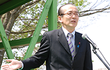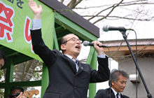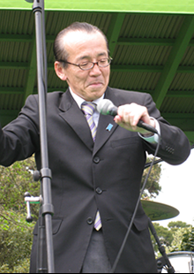 ▼ KSO2をバックに「勝手にしやがれ」を熱唱する小泉一成成田市長さん |