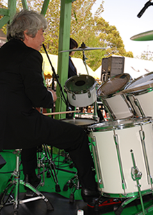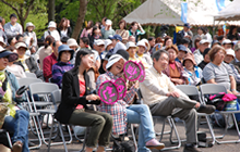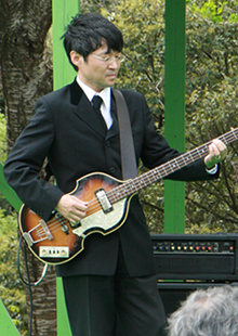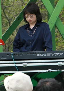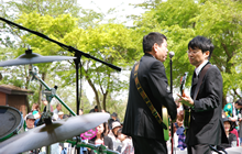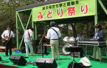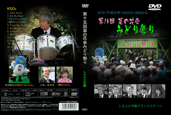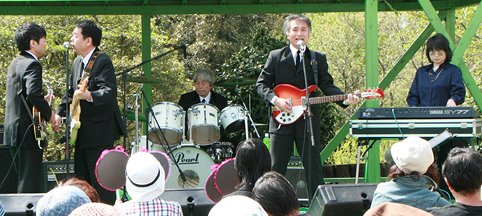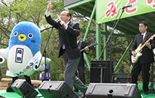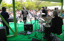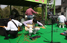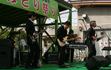 しもふさ学園は、今年で創立22周年を迎え、その歴史とともに「みどり祭り」も地域の方々に支えられ、1000人近くの来場者を迎える法人全体の大きなお祭りとなっております。みどり祭りは福祉施設を理解してもらう為に地域住民との交流行事を行うもので、今年はゲストに「園まり」さんを迎えての催しとなりましたが、KSO2はその前座を務めさせていただきました。成田市長さんも成田市の特別観光大使に任命された観光PRキャラクター「うなりくん」の紹介とともにKSO2の演奏で沢田研二の「勝手にしやがれ」を歌われ、観客からは大声援が飛び非常に盛り上がったライブとなりました。 |